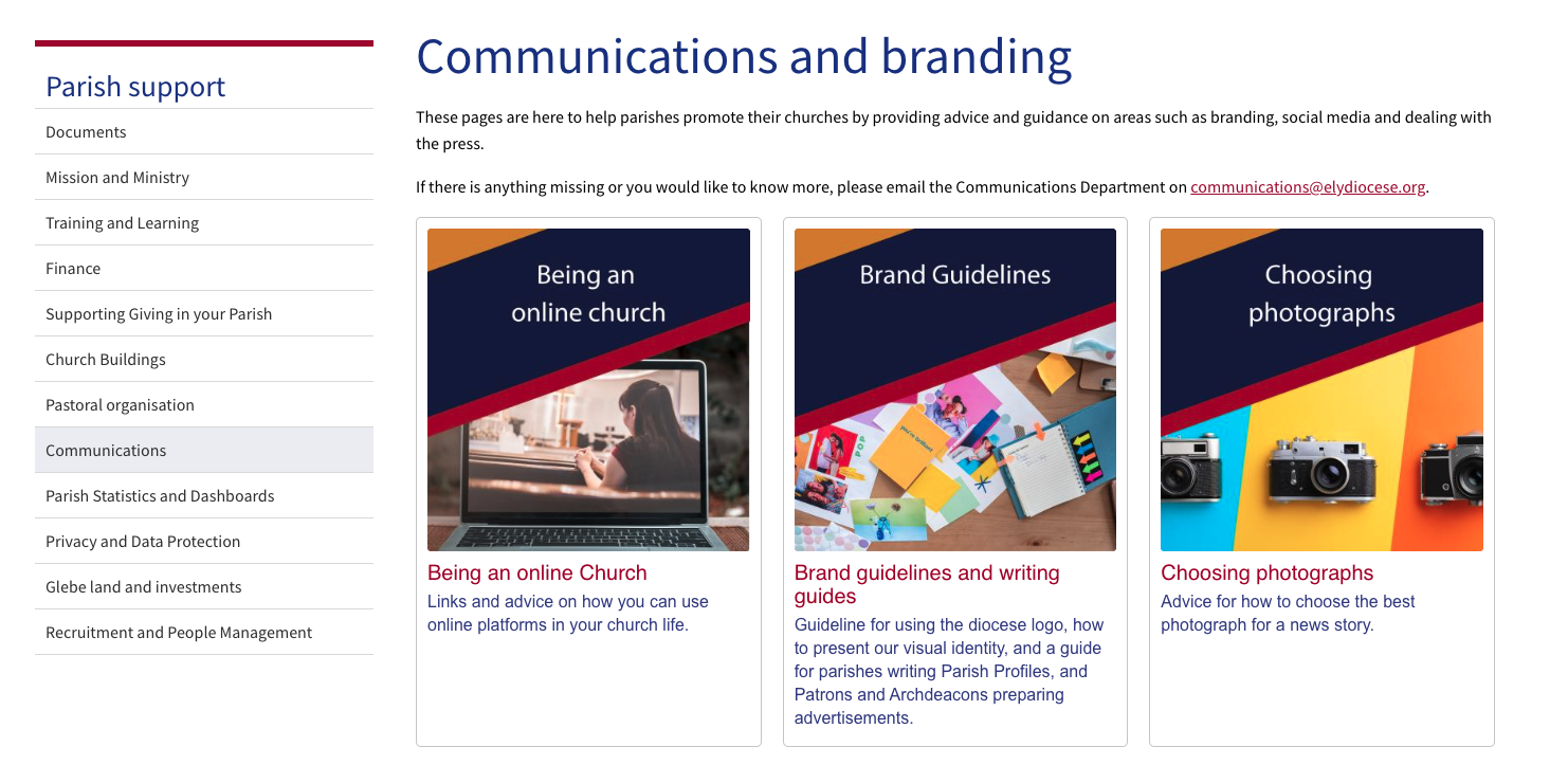 Cards within Church Edit are a way to display links to pages using imagery. Each page you add to Church Edit can have its own thumbnail image that is then shown in search results or when a folder you created has a number of pages listed underneath. You can see an example of Cards in the following screen shot from the Diocese of Ely.